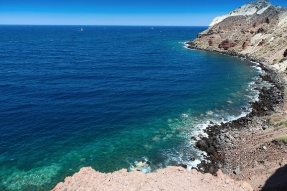 Along the northwest coast, at the base of the crater in the village of Oia, lies the lovely beach of Amoudi Bay, a small picturesque bay discovered only in recent years. Characterized by magnificent crystalline and deep waters, ideal for those who want to immerse for discovering unexpected seabeds, the beach is dominated by the characteristic red rock of Santorini, which makes the landscape particularly spectacular. Located at the bottom of a rocky wall, it is reached by climbing a steep staircase of almost 300 steps or riding a mule.